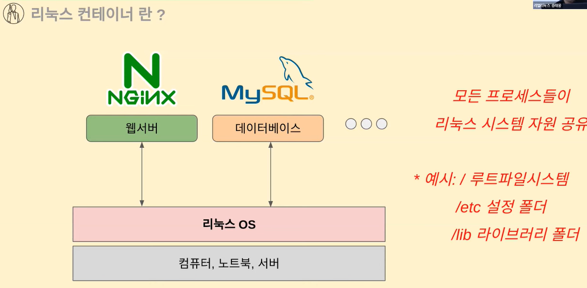 그리고 웹 서버 프로그램이 일반 프로세스가 있다면, 시스템 자원을 똑같이 공유하는 일반 프로세스에, 다만 이런 일반 프로세스를 그냥 프로세스로 실행하지 않고 개별적인 독립적인 환경의 프로세스로 만들어 주는 역할을 하게 되는 거죠.