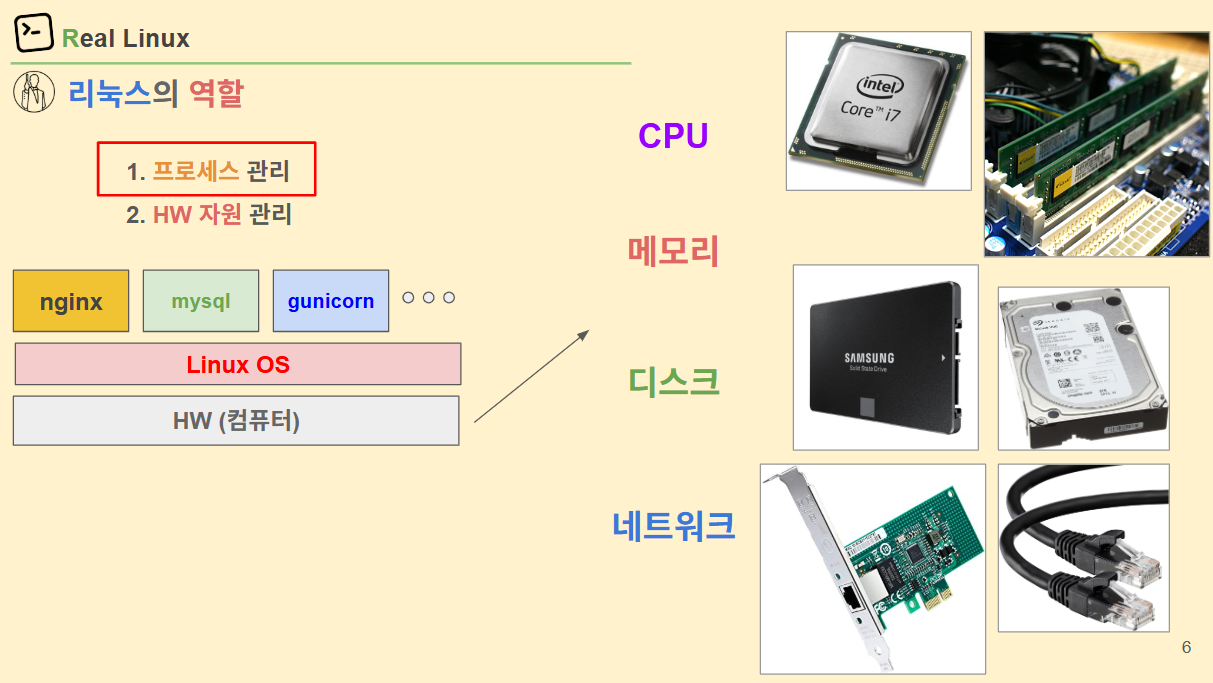 즉, 모든 프로세스는 리눅스를 거쳐야만 하드웨어 자원을 사용할 수 있으며, 이 구조 덕분에 자원 충돌을 방지할 수 있습니다.