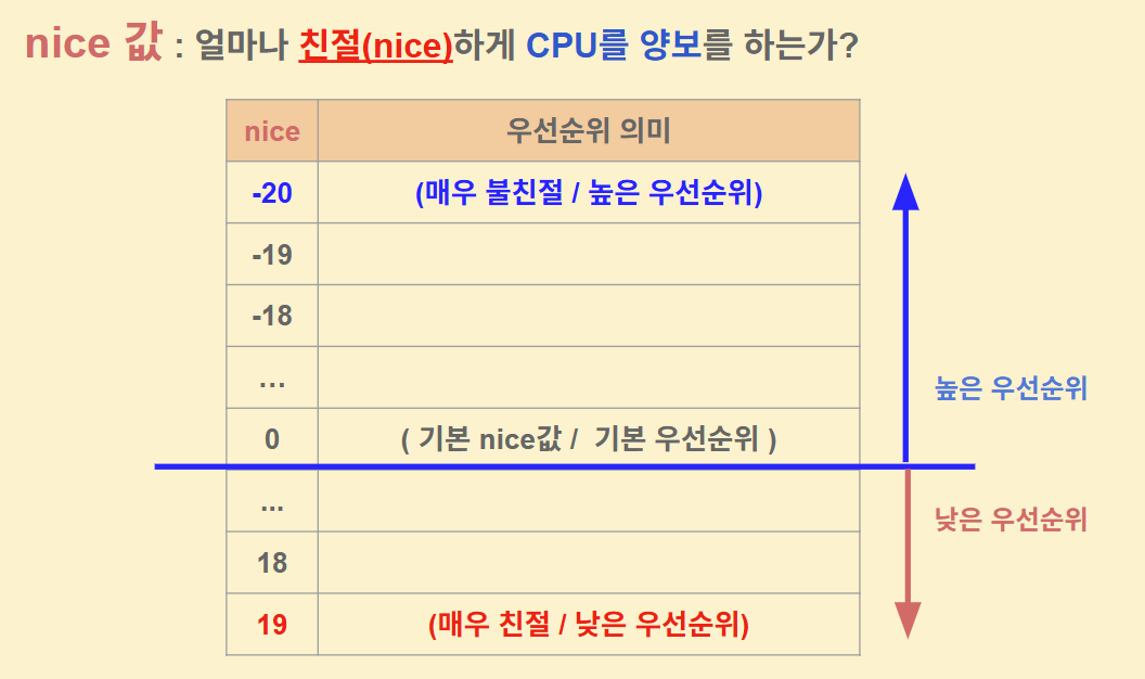 nice값은 프로세스의 “양보도”를 결정하고, -